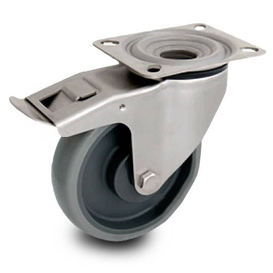 - Lenkrolle mit rostfreier Stahl AISI 304 mit Platenbefestigung und Bremssystem. Räder mit thermoplastischem Gummi. Tragfähigkeit 200kg, Durchmesser 160mm, Kugellager