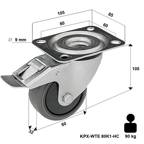 Lenkrolle rostfrei mit Plattenbefestigung und Bremssystem KPX-WTE 80K1-HC mit thermoplastischem Gummi/ Tragfähigkeit 90kg / 90mm/ Kugellager