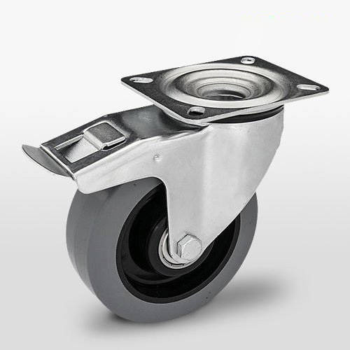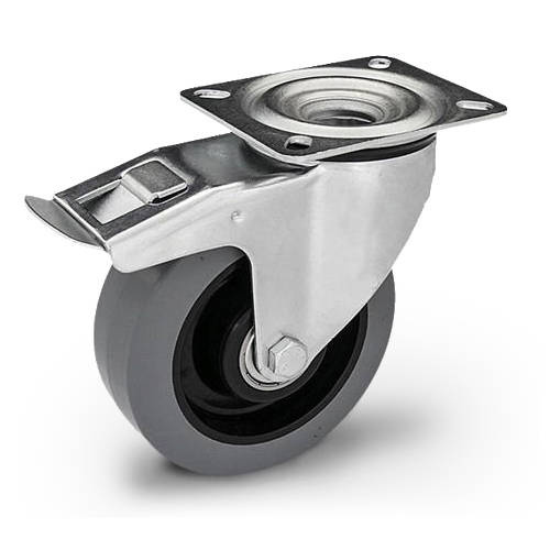 • Lenkrolle mit Plattenbefestigung mit Bremssystem, mittelschwere Ausführung mit Elastik-Vollgummireifen. Radbreite 50mm, Gesamthöhe 195mm.