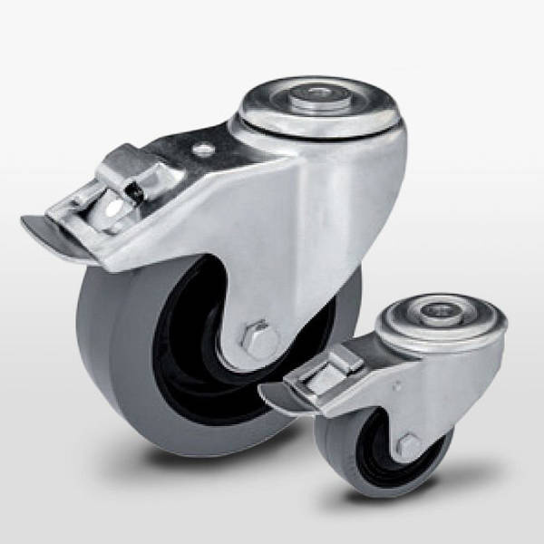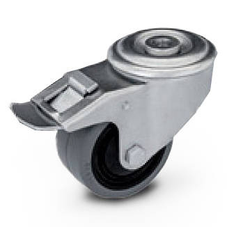 Lenkrolle mit Bolzenbefestigung und Bremssystem KJE-POGES 100K1-HC mit Elastik-Vollgummireifen. Tragfähigkeit 150 kg / 100mm/ Zentralkugellager
