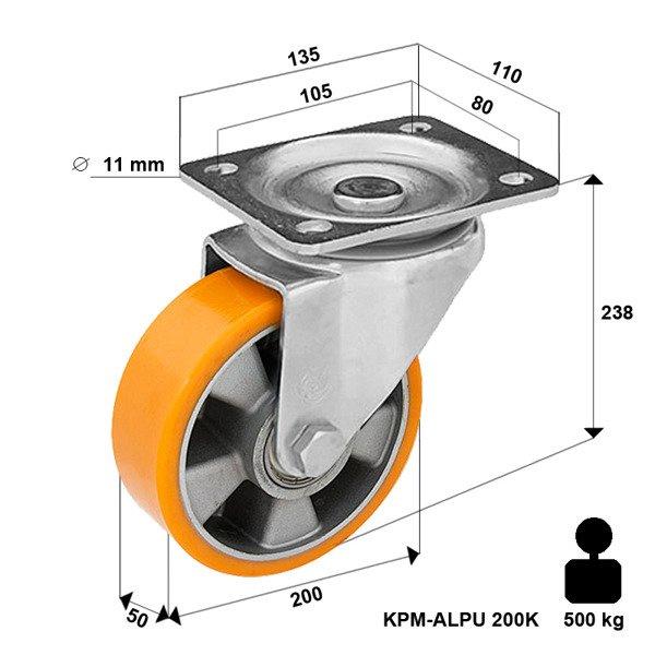 200 mm kółka, wytrzymałe i obrotowe, idealne do wózków transportowych. Nośność 500 kg na koło (1500 kg do 2000 kg na 4 kołach)! Niezawodne kółka przemysłowe dla platform transportowych. Skrętne i niezawodne, nasze mocne koło ALPU to kluczowy element wózka. Wybierz zestaw kołowy KPM-ALPU 200K i zapewnij sobie bezawaryjną mobilność na długi czas!
