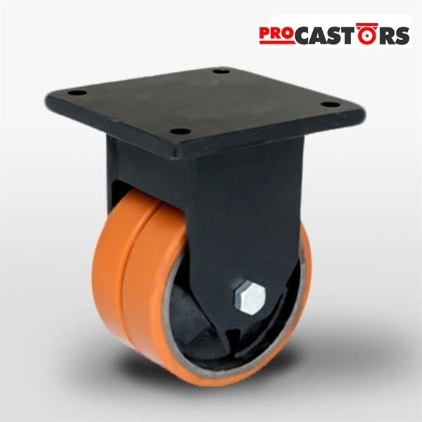 - Schwerlast-Doppel-Bockrolle mit gegossenem Polyurethan-Laufbelag. Gehäuse aus Stahlblech geschweißt, lackiert. Rad aus aufgegossenem Polyurethan, spurlos, Radkörper aus Grauguss, Doppelkugellager